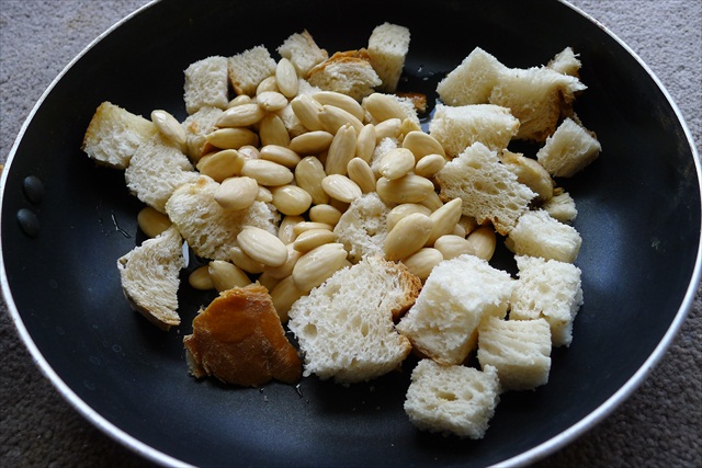 4) Add the garlic and sautee with the almonds and bread for 1-2 minutes, being careful not to burn.