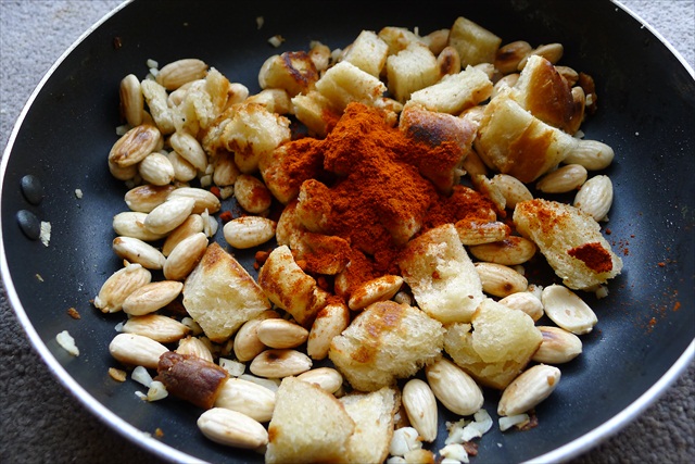 3) To make the romesco add the 1/4 cup of olive oil to the fry pan. Add the almonds and the bread and place over a medium heat. Toast until the bread and almonds are bronzed.