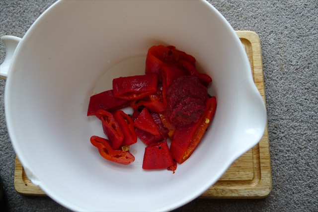 6) Add the drained peppers to a food processor, or a bowl that you can use a stick blender with.