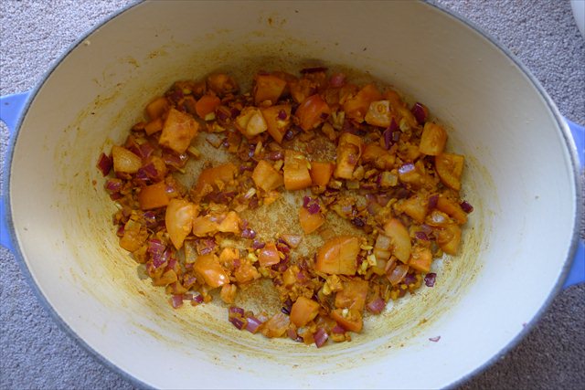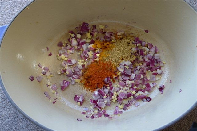 1) In a heavy bottom pan or Dutch oven place the oil over a medium heat. Sautee the onion with the garlic and ginger for 3-4 minutes until they have begun to soften.
