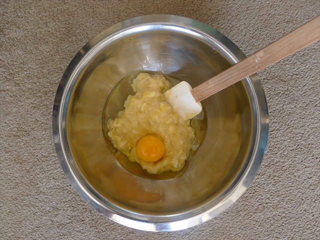2) Muddle together the banana, oil or butter and the egg into a slurry. It will look curdled and unpleasant. Don’t fear.