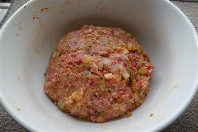 4) In a mixing bowl combine the mince, beaten egg, grated parmesan, chopped parsley, tomato paste and dijon mustard.