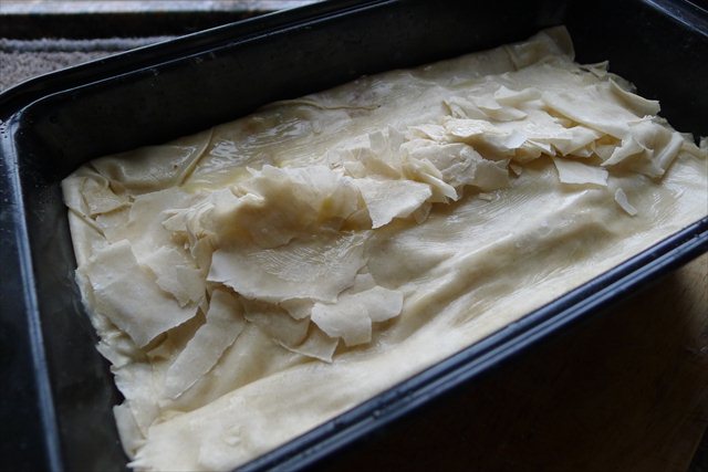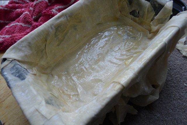6) Take one sheet of filo pastry butter it. Lay it horizontally across the loaf pan, leaving the excess to drape over the sides. Then butter another sheet and place another at right angles, like a cross so it covers the narrow ends. Repeat twice more until you have used all your filo.
