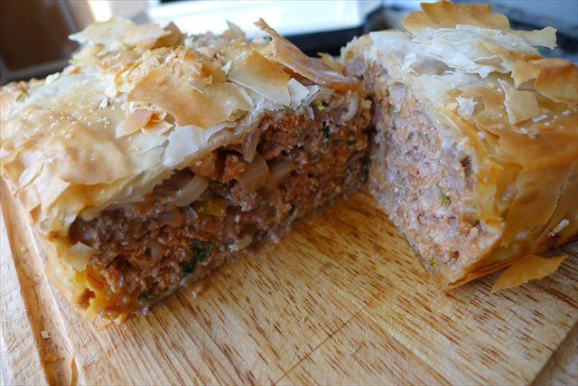 By taking a couple of things that were lying around the house; a loaf tin and some stray strips of filo pastry from the freezer- this manages to MacGyver your midweek meatloaf into something special.