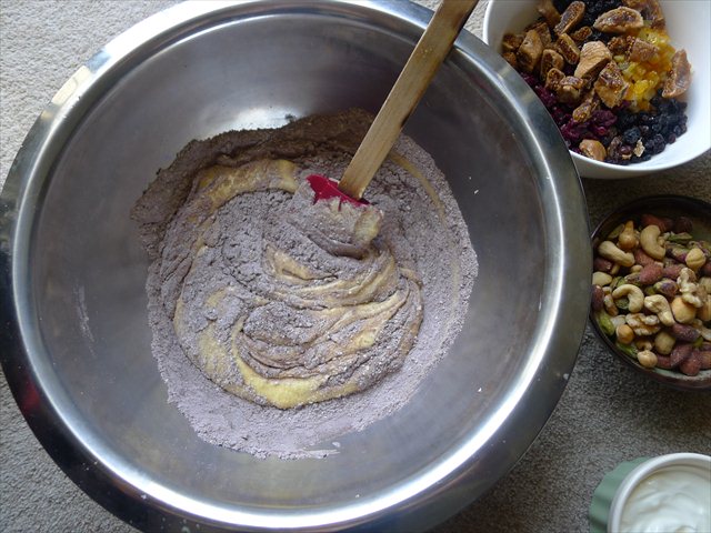 5) Fold in 1/3 of the dry ingredients, then 1/2 of the yoghurt.