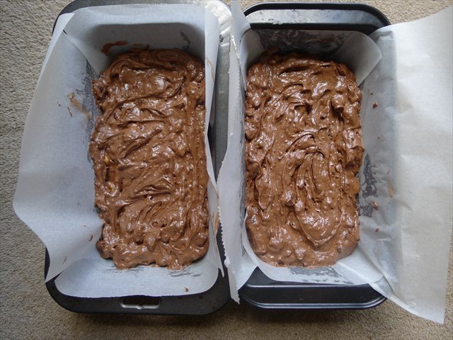 9) Portion the batter into the two prepared loaf tins.