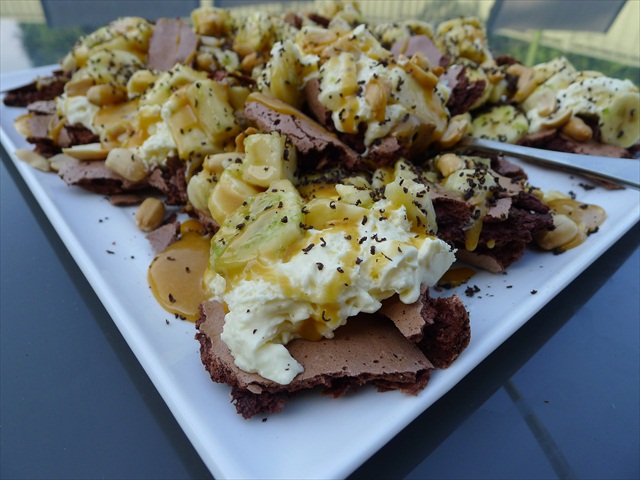 3) Drizzle the meringue/banana and cream with 1 cup of the caramel sauce (leave the remainder for those who feel like indulging more, or for serving with ice cream or brownies). Top with peanuts and grated chocolate. Serve immediately from a platter.