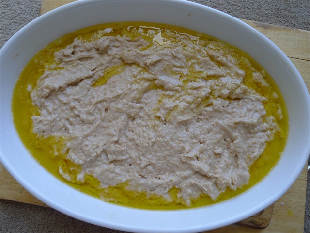 6) Dab the batter over the top of the melted butter. The butter will seep and trickle around the edges and form a lake-like perimeter. That’s ok.