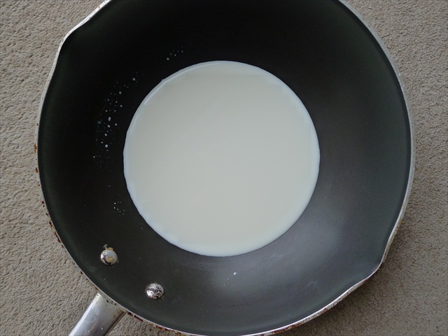 1) Combine 1 1/2 cups/ 3/75 ml milk with 45 g of caster sugar in a wide saucepan over a medium/low heat. Whisk to dissolve the sugar and bring the liquid to a gentle simmer.