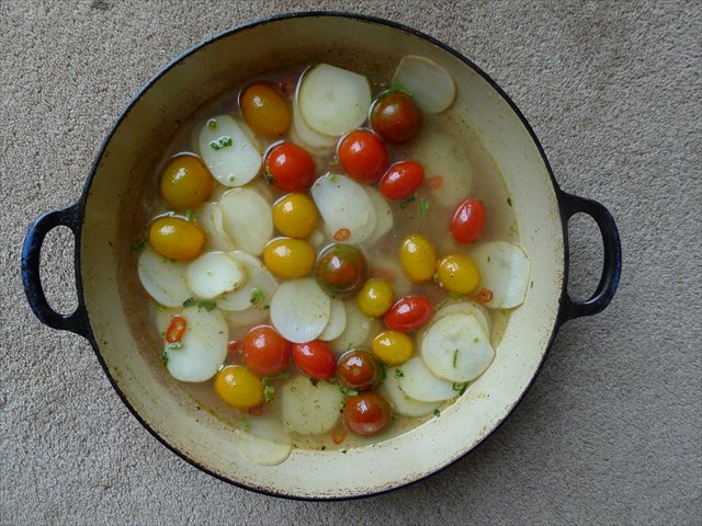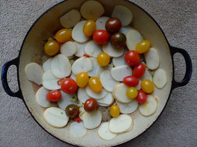 3) Add the remaining olive oil to the bottom of the pan. Add the garlic and chilli and sautee for 1-2 minutes, being careful not to burn the garlic. Add the potato slices, cherry tomatoes, salt and water. Bring to a simmer.