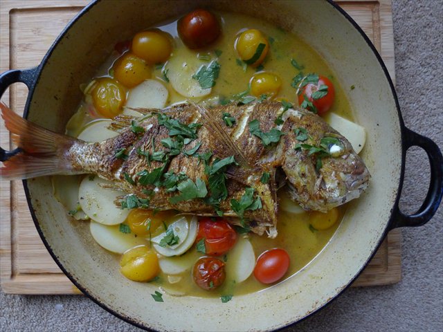 4) Return the fish to the pan and place on top of the potatoes and tomatoes. Place the lid on the pot and simmer gently for 15 minutes, until the flesh of the fish is soft and the eyes of the fish have turned opaque. Gently remove the fish and set aside. Bring the crazy water up to a boil and boilstrongly for 5 minutes, to ensure the tomatoes are pulpy and the potatoes are cooked through. Serve the fish scattered with fresh herbs, with the tomatoes, potato slices and drizzling of the spiced crazy water as sauce. When serving the fish flesh should slip from the skeleton, though be careful, there may be some bones.