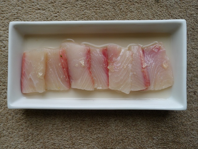 1) Steep the sashimi slices in the vodka and olive brine for 15 minutes before serving.