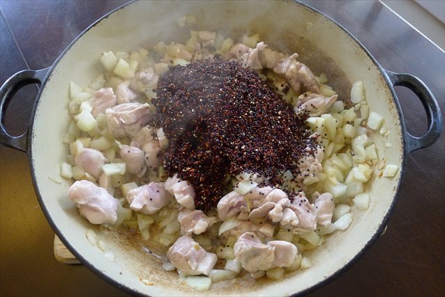 5) Add the diced chicken thighs to the pan and sautee for 1 minute.