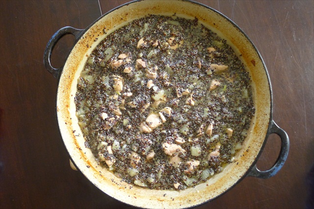 6) Add the rinsed quinoa to the pan.