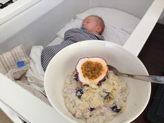 Having a big tub of bircher muesli in the fridge was a saviour. It meant that breakfast (at 3 am, or 11 am), or a sustaining snack was ready cued- all I needed was a bowl and a spoon, The quinoa here adds some extra protein and the flaked almonds are also a boon for supply. It’s also an easy thing to mix together while totally sleep deprived, one handed, or to ask someone else to do for you.