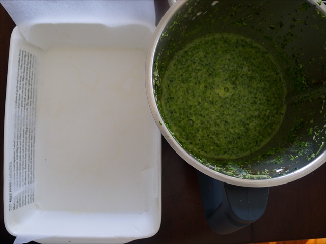 2) Line a large (30 cm x 20 cm) baking dish with greaseproof paper (this will make it easier to lift the frittata out). A little bit of butter or oil underneath the greaseproof paper will help it stay in place.