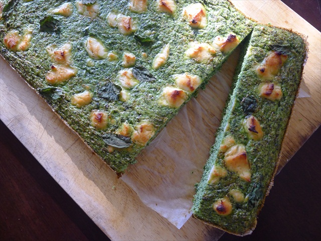9) Bake for 35 minutes, until a knife comes out clear of raw egg. Allow to cool, then carefully lift it out of the baking dish. Either cut into small squares for portable snacks for you and small people, or into large wedges to eat with roasted tomatoes and garlic and a splodge of yoghurt for a light lunch/ brunch or easy dinner.