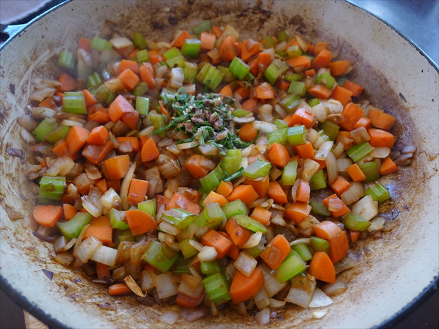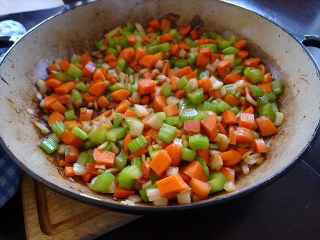 4) Remove all of the meat from the pan, turn down the heat to medium and add the onion, carrot and celery. Sautee for 5-7 minutes, until the onion is softened.
