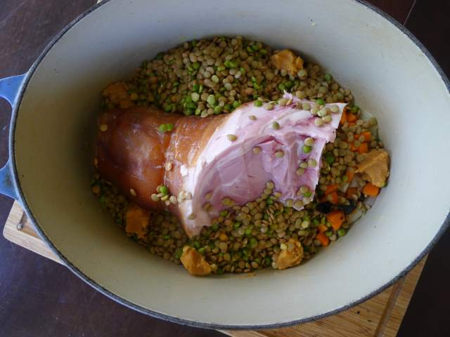4) Cook with the lid on at a gentle simmer for 1-2 hours, until the lentils have begun to break down and the ham is shrugging off the bone.