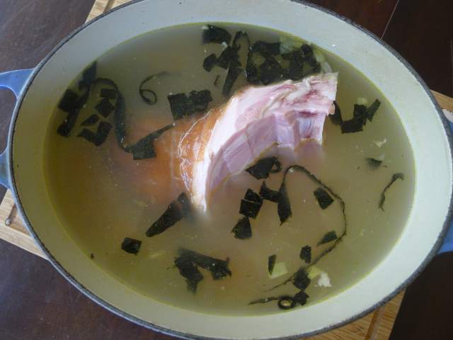 I was going to write about how this version that I’ve just been toying with is even better. It still includes the wakame, but instead of the simple still note of green split peas there’s additional texture and colour from edamame- those Japanese immature soybeans which you can buy frozen in packets from most Asian grocery stores. I was going to wax on about how the white miso adds a mysterious sweetness and depth to this peasant staple. About how this is the perfect thing to make with your leftover ham bones in this festive period of the year. A prudent home is a happy home.