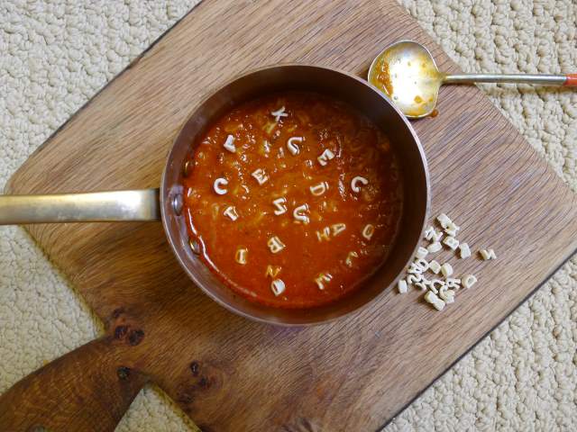 Mathematician Alan Turing(Benedict Cumberbatch) is a curious fellow. For one, he doesn’t like sandwiches. He’d rather a bowl of broth for lunch. What he does like, is puzzles. And there is no greater challenge facing the allies during World War Two than cracking the elusive German code. Unraveling the chaotic soup of letters the Enigma Machine churns out every 24 hours requires more than the most fluent linguists and cryptologists. It takes a mind like Turing’s. For ‘sometimes it is the people who no one imagines anything of who do the things that no one can imagine’. And sometimes it’s the most unlikely combination of flavours that will make a simple dish shine. This German classic of Gulyassuppe may at first glance resemble a simple tomato soup, but soon the differences will make themselves plain. The secret is the Teutonic rasp of carraway seeds, softened by the silkiness of pork fat and brazen confidence of paprika. It’s a curious combination, but it works. For texture and sustenance add a good shaking of alphabet noodles and allow them to lurk beneath the surface as undetected as Uboats. Or shuffle them to the surface and try to make sense of what you see. Don’t fret too much if you can’t make head or tail of your very own German Alphabet Soup. Lucky for you, the fate of the world doesn’t depend on it.