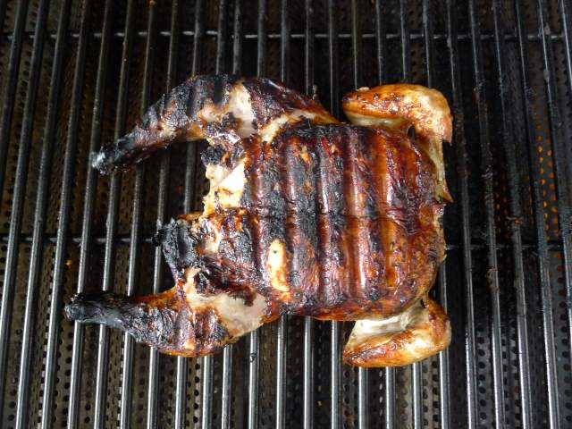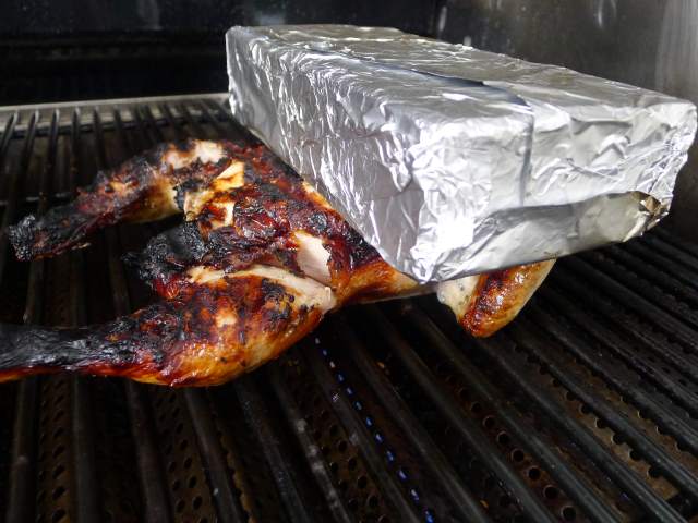 5) Balance one of the bricks over the breasts of the bird. Grill for another 15-20 minutes, until the juices from between the legs run clear.