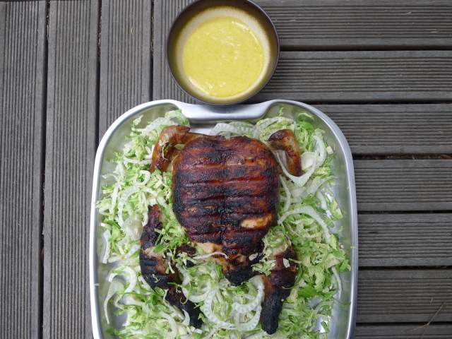 1) Ensure that the backbone is cut out of your chicken. Whisk together the marinade and pour it over the chicken, rubbing it into the skin.