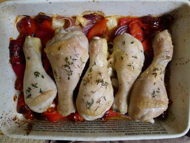 3) Bake for 40 minutes. After 40 minutes, when the tomatoes are puckered and blistered add the charred peppers and lay the drumsticks over the top. Sprinkle the drumsticks with the remaining thyme, olive oil and the salt.