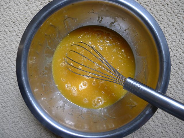 4) When the honey has cooled, add the eggs and whisk well to combine.