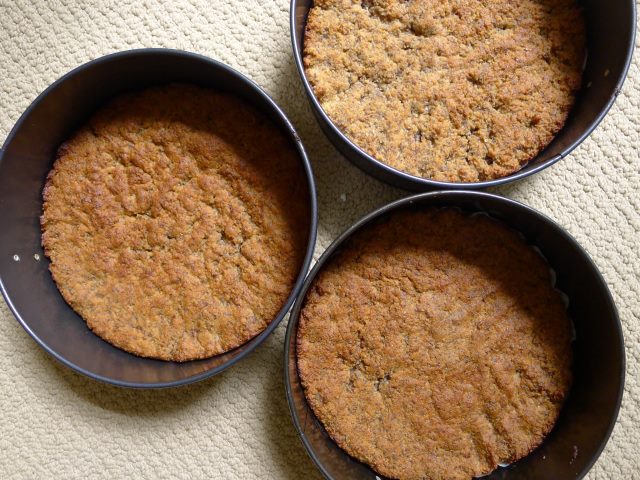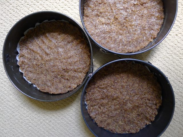 6) Divide the mixture evenly between the three cake tins, using damp fingers to press it out evenly to the edges if you need.