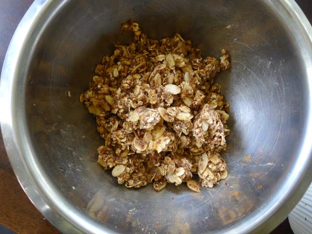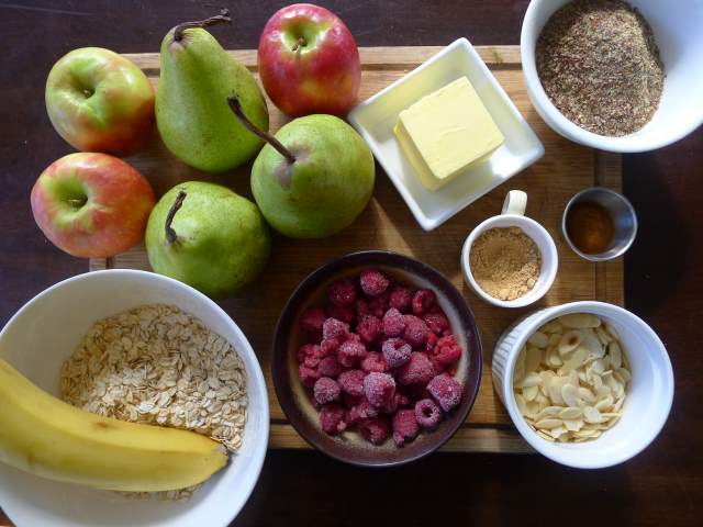 2) To make the crumble topping, put 100g g butter, oats, flaxseed, almonds, banana, ginger and cinnamon in a bowl. Use your fingers to mash everything together into a rustic tumble. It should be rough and lumpy. Place in the fridge until it is ready to bake.