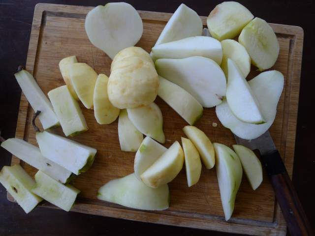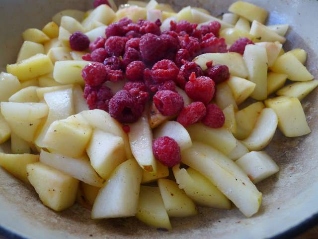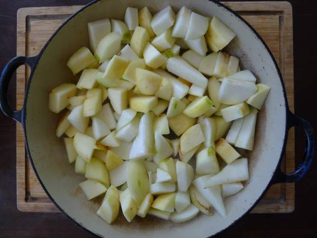 3) Put the apples and pears in a pan with 30 g butter and cook over a medium heat for 10 minutes until the fruit has begun to soften.