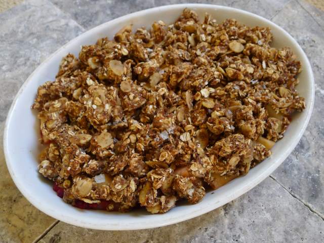 5) Scatter the crumble over the fruit, ensuring there are lots of craggy edges. Either bake now, or set aside until you plan on eating.