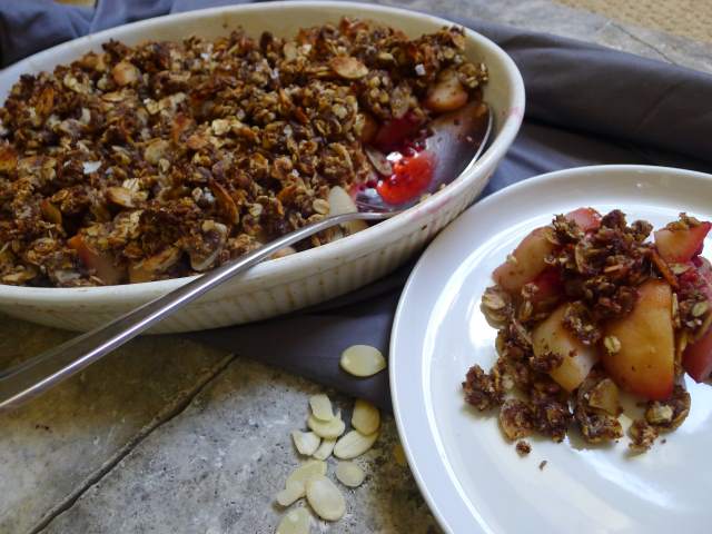 6) Bake the crumble in the preheated oven for 30 minutes, or until the top is bronzed and crisp. Serve hot with greek yoghurt, cream fraiche, double cream, custard or ice cream. Or enjoy cold, for breakfast.