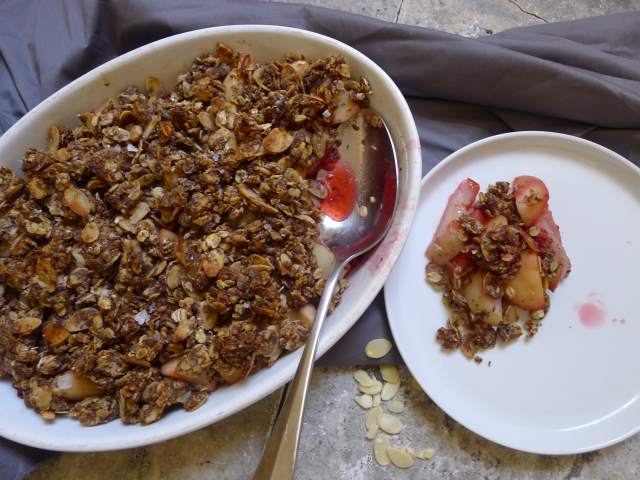 Take this crumble as a template; swap the fruits to whatever takes your fancy. It’s a variation on one of my favourite recipes from ‘Cut the Carbs’; the blackberry, apple and rhubarb crumble. There’s a delightful chewy rubble to the topping, care of the smashed banana which lends it sweetness and heft. Here I’ve made it without any additional sugar at all, but if you were using particularly tart apples, or felt like you need a little more indulgence feel free to add 40g of dark muscavado sugar into the crumble, or a few blitzed dates. This is a terrific exercise to get small people involved in. It’s a simple process of weighing out the ingredients and then mashing and rubbing it together with your fingertips, which is messily tactile, but not overwhelmingly so. It might be worth making double of the crumble and stashing some in the freezer for a day which screams for pudding, when time is not on your side.