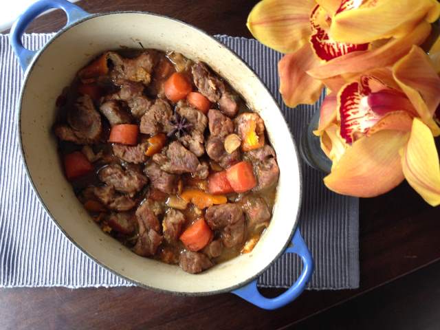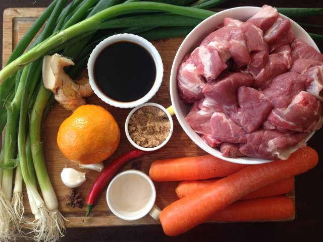It’s not often that you’ll find something Chinese hanging out next to the ice cream. But there’s no reason it can’t. You don’t have to constrain these warming flavours to swift Szechuan stir fries (like this) or soups. Low and slow will work just as well. As for proteins; beef cheeks or chuck would work in this recipe, as would chicken legs or thighs, but it’s the natural sweetness of pork which makes this particularly stellar. The aromatics are also key; there’s a curious prickling heat from Szechuan peppercorns, freshness from both the ginger and mandarin peel and an exotic twang from the star anise. The mandarin peel may seem curious- something that might be more at home in the compost than a Le Creuset, but trust me. It’s killer. You could easily bulk this braise it out with chunks of daikon or peeled sweet potato, but I find simple lumps of carrot work just fine.