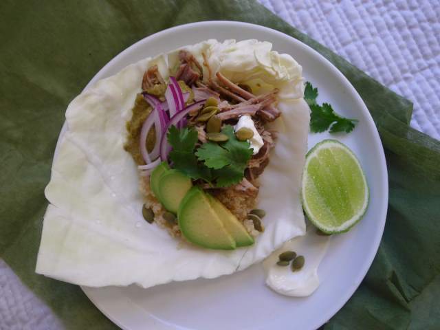Green cabbage leaves (as grain free tacos), or corn tortillas