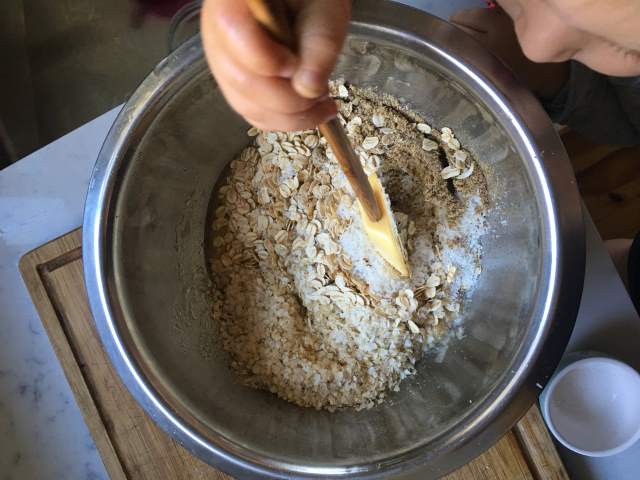 One simple way to keep him entertained is to bake together. He’ll happily stand up on a stool and mash and muddle, help me use the scissors to snip dried apricots (aka ‘COTS!’) into tiny pebble-pieces and sift together dry ingredients.