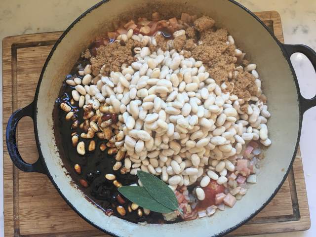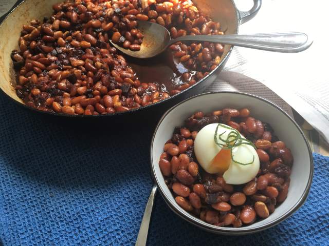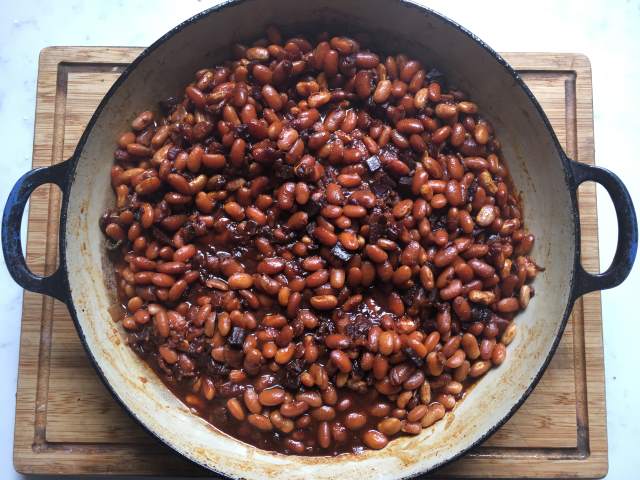 6) After three hours the beans should be cooked through and most of the liquid absorbed. If there is additional liquid, cook with the lid off until there is a viscous sauce to coat the beans. Season with salt to taste.