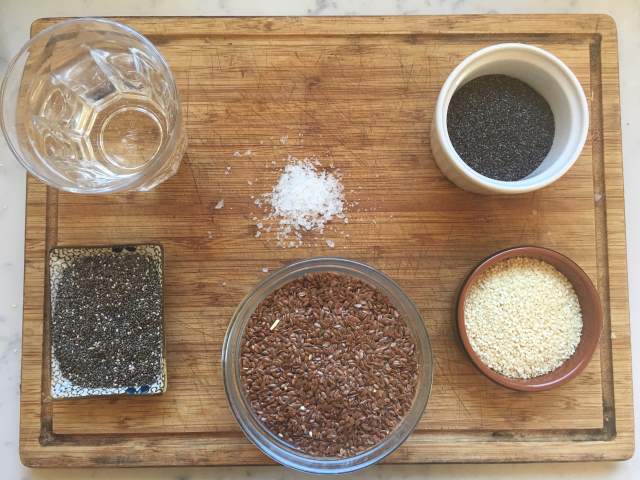 Makes approx 30 crackers. Nb, it is the magical ability of flax seeds and chia seeds to swell and bind with water which allows these crackers to hold together and snap. You can swap the poppyseeds and sesame seeds for other smaller seeds of your choice, but the flaxseeds and chia are essential components).