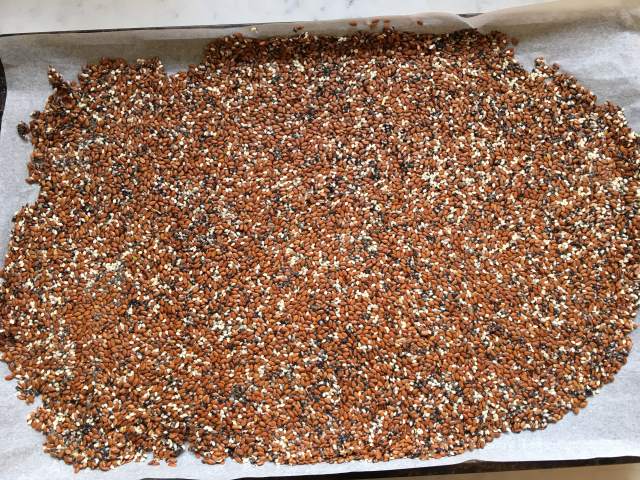 4) Transfer the seed mix onto the baking parchment and flatten it out with your hands. Add another sheet of parchment over the top and roll out until you have a large rectangle, approx 3 mm thick. Gently peel off the top layer of parchment.