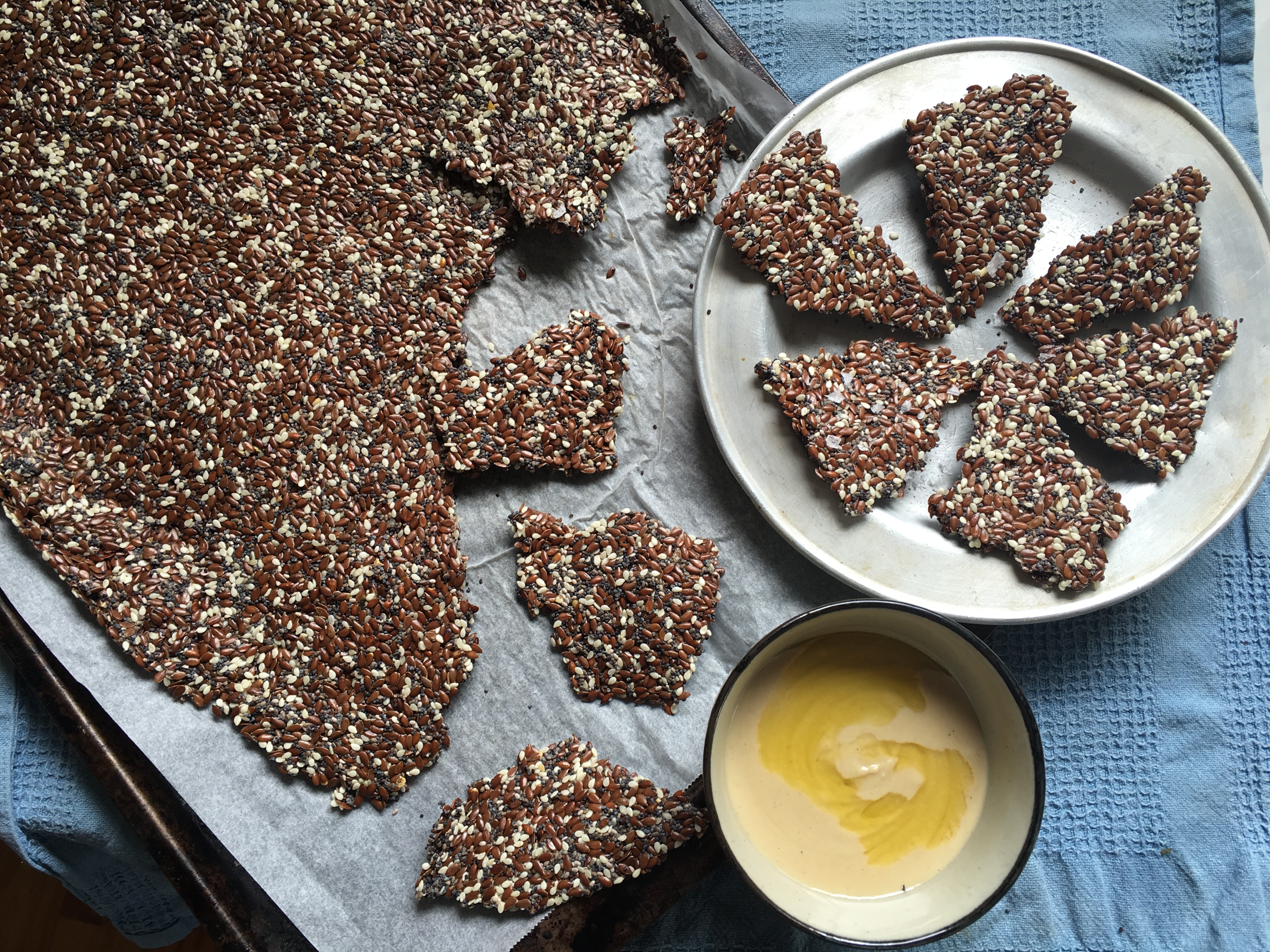 5) Transfer to the oven and bake for 3 hours, until dry and brittle. Allow the crackers to cool in the oven, then break into shards and serve with the dip or pate of your choice, or tahini with olive oil (as above).