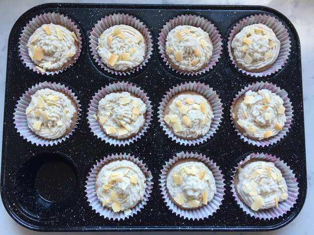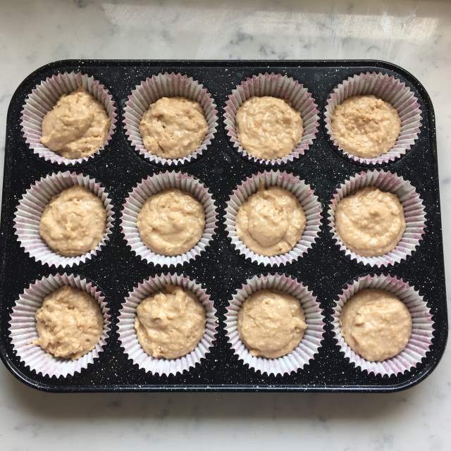 5) Transfer the batter into the baking cases, filling them no more than 2/3 of the way up. (It may help to use an ice cream scoop to do it neatly).