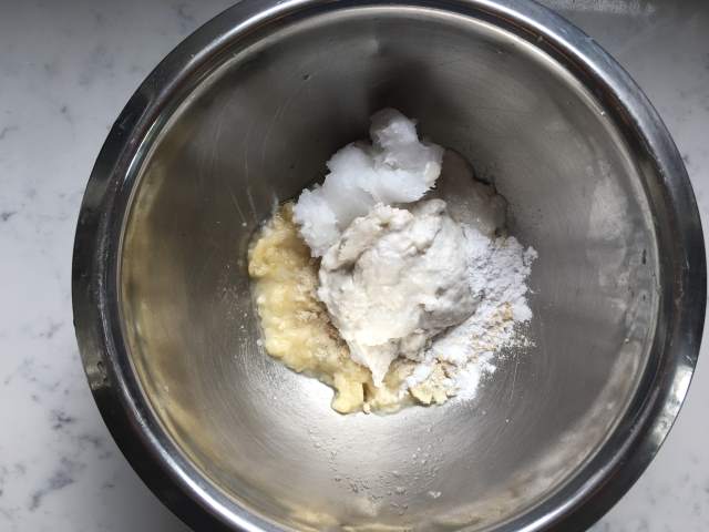 3) In another bowl beat together the coconut oil and sugar until well combined.
