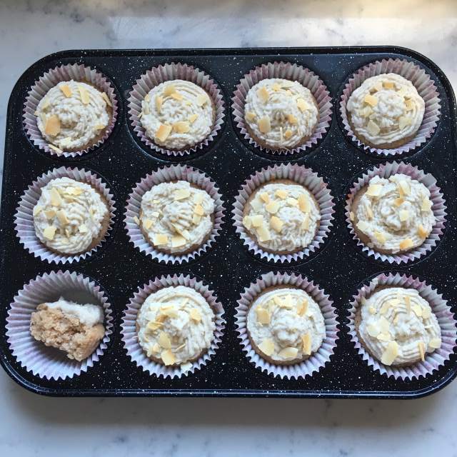 They say you don’t realise how good you’ve got it, until it’s gone. I am now, and forever appreciative that we can swiftly whip frosting for cakes in this house out of cream cheese and a little sweetener (see last week’s double decker carrot cake for a prime example). I also know that the vegan chocolate mousse I posted a while ago, with avocado and cacao/cocoa would also make a noble frosting option. But when it’s blonde cupcakes you’re after, to celebrate the birthday of the fair maiden that’s captured your son’s heart, then this is one option that’s worth having in your arsenal.