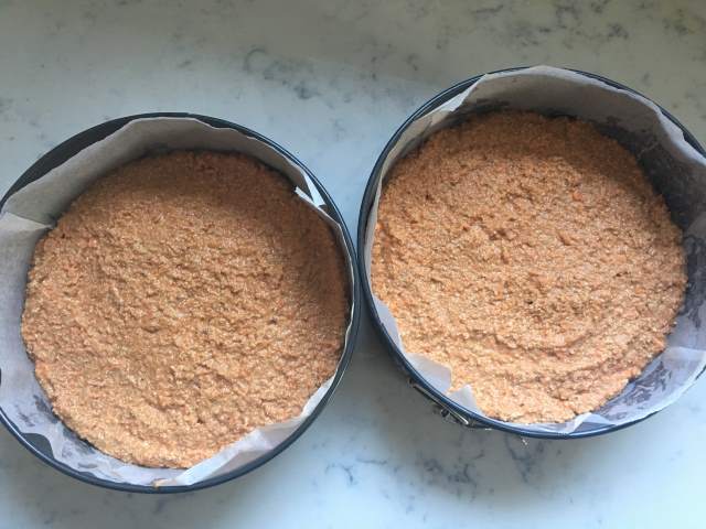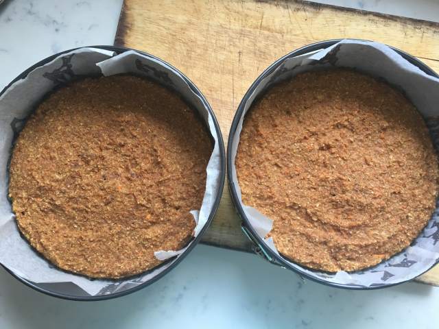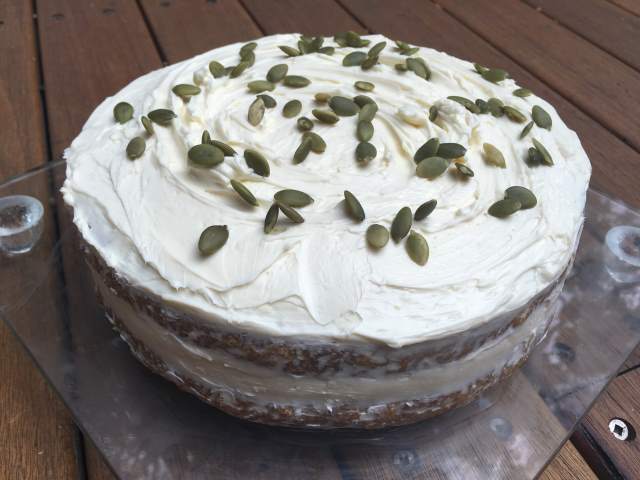 7) To make the frosting whip together 500 g of cream cheese with 3 tbsp of sweetener of your choice (add more or less to taste). Use 1/3 of the frosting in the centre of the cakes and then use the rest on the top, and if you like, around the sides. Festoon the cake with pumpkin seeds/pepitas or coconut shards, then serve.