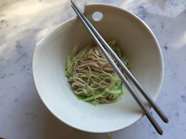 The inspiration for these noodles is the American Chinese take away classic of sesame noodles. It deploys pantry staples with strapping shelf lives, like buckwheat noodles, peanut butter, tahini, soy sauce and sesame oil. You could of course make it entirely with noodles (wheat, rice, what have you- but I love the savoury flavour and lower GI of buckwheat soba), but in an attempt to add a little more vegetables I’ve leaned on cabbage slivers to bulk it out, which work in a similar way to zucchini ‘zoodles’ – without the need for an additional piece of kitchen kit, or a kitsch name.