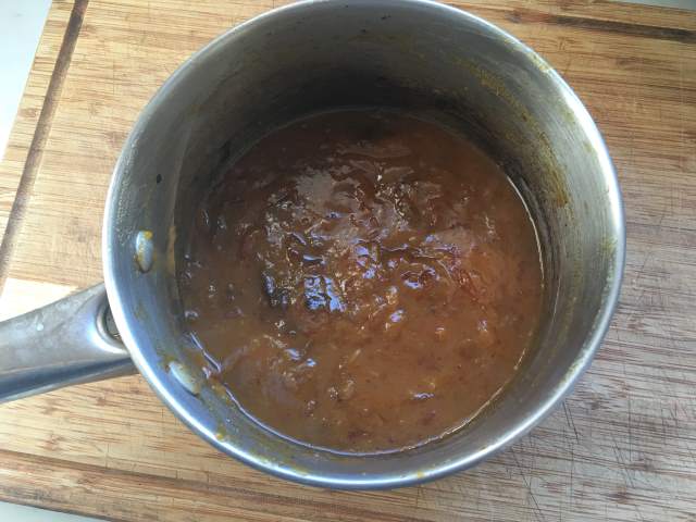 2) Simmer together orange juice and chopped dried fruit for 10 minutes, until the fruit has broken down into a jammy slurry.