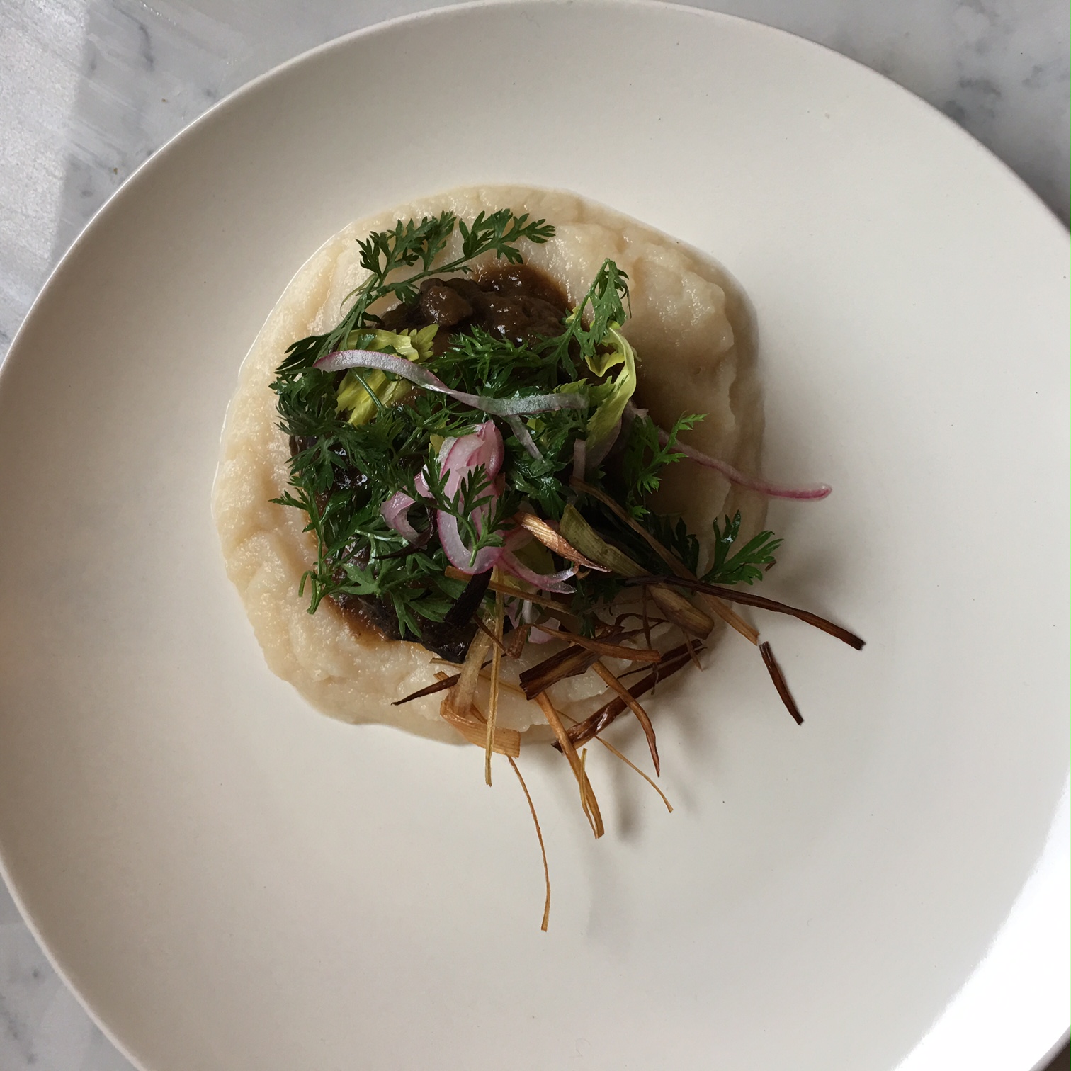 Sunday was the first step back into the breach. We started local, with a birthday celebration for my Dad. It was a family feast for six, with him and my step mother, my stepsister, partner and toddler to round out the group. The weather was bitingly cold so we opted for a menu of coddling comfort. There were slow roasted beef cheeks in red wine, with a shallow moat of cauliflower puree, some frizzled leeks for brittle crunch and a zippy salad of carrot tops, celery leaves and quick pickled onions for contrast. I was pluckily chuffed with the thriftiness of the salad- the celery leaves and carrot tops were left over from the mirepoix that went into the base of the braise. My late, very English grandparents, who took pride in finding a purpose for every scrap would have approved. On the side we had steamed greens and confit carrots – and a stunningly good bottle of red that Dad plundered from his cellar. It was hearty and stilled filled the combined brief of satisfying the carnivorous males at the table, as well as those of us with slow carb preferences.