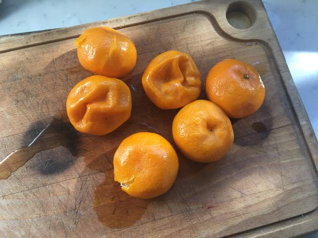 2) Remove the mandarins from the heat and cut in half around the equator to help cool and to reveal any seeds that are inside. Remove seeds and bring to room temperature.